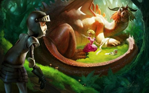 Дракониха изумленно глянула на принцессу и впервые в жизни не нашла, что сказать. Это было таким удивлением, что она даже забыла о чем они вообще говорили! И тут из-за дерева появился недобитый и ненайденный драконихой рыцарь. Он прятался в яме для отлова зверей, пока разгневанная дракониха пролетала сверху. Лошадка от него убежала, куда глаза глядят, а рыцарь в потемках провалился в яму. Там и сидел, пока добрый лесничий не помог ему выбраться.