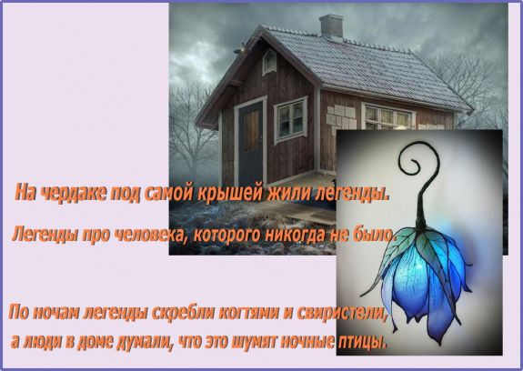 На чердаке под самой крышей жили легенды. Легенды про человека, которого никогда не было. По ночам легенды скребли когтями и свиристели, а люди в доме думали, что это шумят ночные птицы.