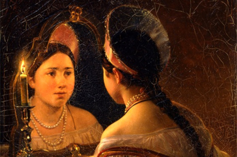 Молодая девушка сидит перед зеркалом. По обе стороны от блюдечка горят свечки, пламя их чуть колеблется от её дыхания, едва заметного — она и дышать-то боится.