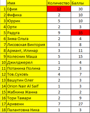 Этот раунд проходил довольно трудно. Но на удивление в упорной борьбе. И даже не раздавший свои шары игрок со скромным ником «Опиум для народа», а шаров три, сейчас не сможет повлиять на результаты этого раунда. Поскольку победил игрок светлой стороны - Ротгар_ Вьяшьсу с 11 баллами!
