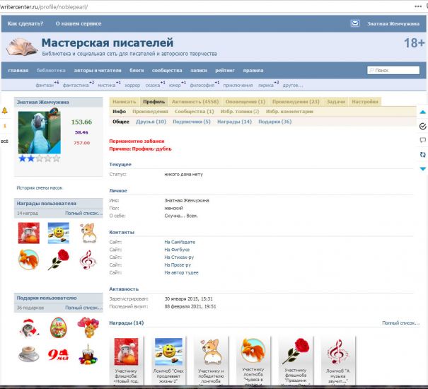 Сегодня обнаружила, что у меня забанен профиль «Знатная Жемчужина», созданный для работы под псевдонимом. Ну да, я помню, общественность меня уже давно хотела наказать за КЛОНЫ, и наш любезный Админ пошёл на поводу встречу, не смог отказать хорошим людям в вежливой, обоснованной и оправданной просьбе!