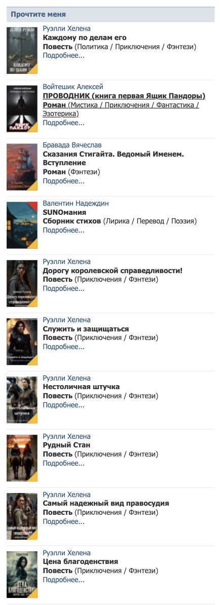 поскольку сам, грешным делом, эту фичу исправно юзаю, я тут случайно заметил, что автор Руэлли Хелена как-то неуёмно пользуется возможностью пиара своих творений на главной странице – на данный момент из всего ДЕСЯТИ мест в списке «прочти меня» её работы занимают аж СЕМЬ позиций… уместна ли такая активность? может быть, имело бы смысл ограничить количество одновременно выставляемых в этот, довольно короткий список, лотов от одного автора, скажем, одним или – максимум – двумя?