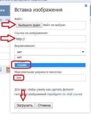 — в открывшемся окне выберите файл или вставьте ссылку на картинку, выровняйте справа, задайте ширину 300.