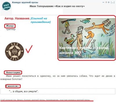первой строкой — ссылку на топик конкурсного произведения в блоге «Конкурс крупной прозы».