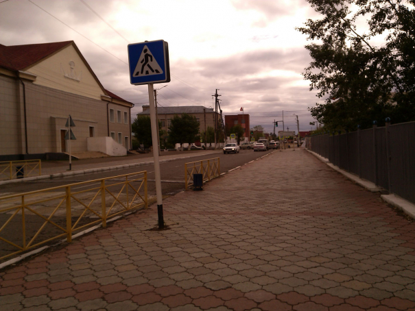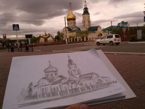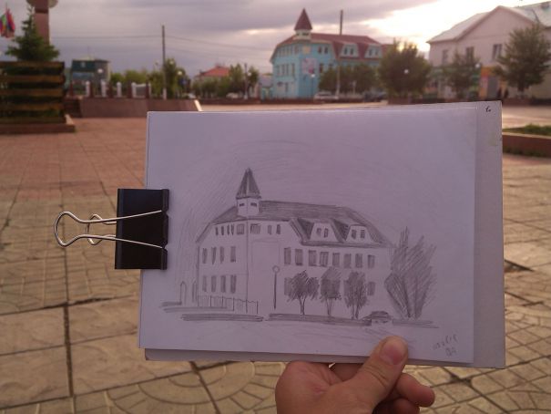 Встали в 6.00. Даже немножко пораньше. Умылись и позавтракали. Вышли на свой первый этюд. Как видно из темы дня, рисовать предполагалось в черте городка. Организаторами велено было прийти на центральную площадь. Туда мы и отправились.