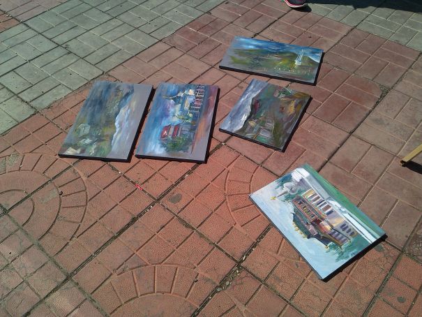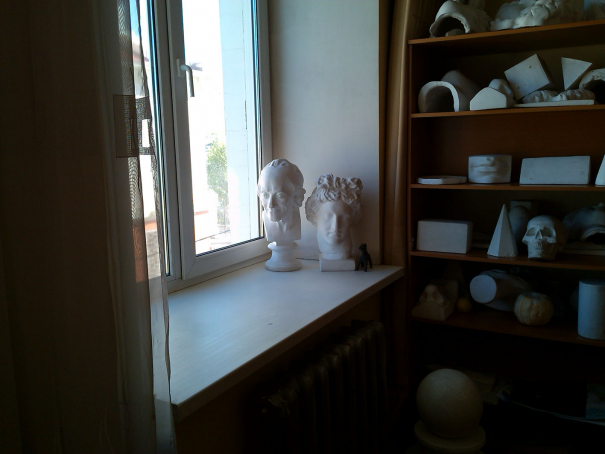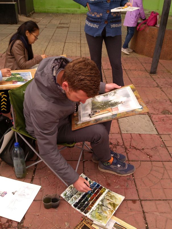Погода, как и накануне, была дождливой и холодной. Сначала для «разогрева» поделали зарисовочки, понаблюдали за тем, как другие рисуют. Затем отправились еще раз позавтракать и позже, когда все нормальные люди возвращались с утреннего этюда, мы отправились его рисовать. Фотографировать было особо некогда, поэтому вот: