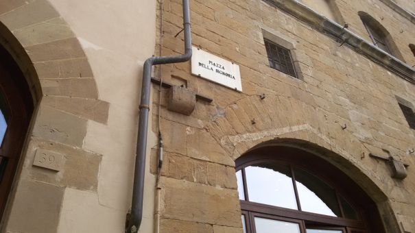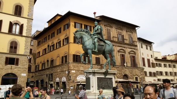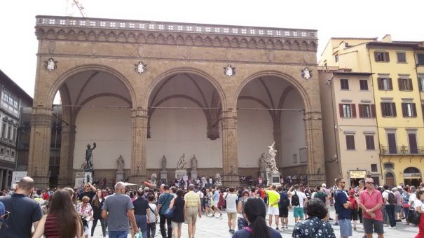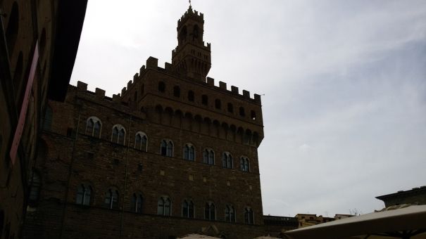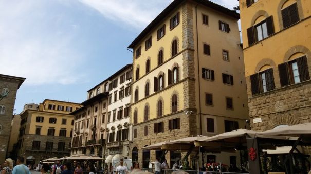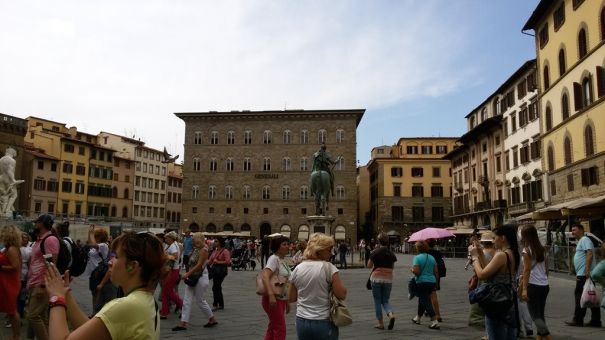На фото ниже маленькое серенькое невзрачненькое здание в уголку — это галерея Уффици. Там где картины да Винчи, Микиланджело… Мега-крутая галерея, куда попасть очень сложно из-за длиннющих очередей)) Оказывается, билеты можно было купить онлайн, но узнала я об этом слишком поздно. Так что пришлось отложить поход до следующего раза))