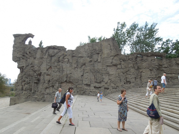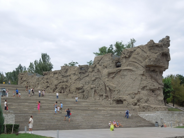 А вот и подножье Мамаева кургана. На барельефе изображены люди разных возрастов и поколений, которых объединяет память о Великой Победе. Как раз к нам подошла женщина, продававшая букеты. Экскурсовод сказал, что на самой вершине кургана они нам пригодятся. Поверив его словам, я взяла один.