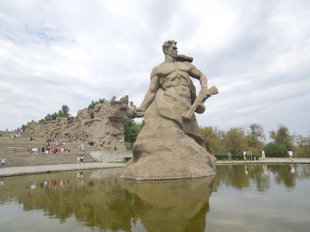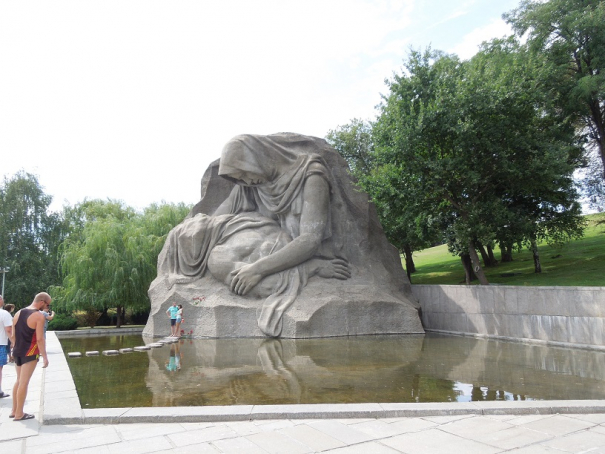 Остановились мы на площадке возле статуи обнажённого солдата, вросшего в обмываемую Волгой родную землю (вот почему эта статуя посреди бассейна). Своим могучим телом он закрывает от врагов мать-старушку. Возможно, скульптор изобразил генерала Шумилова, который руководил обороной Сталинграда.