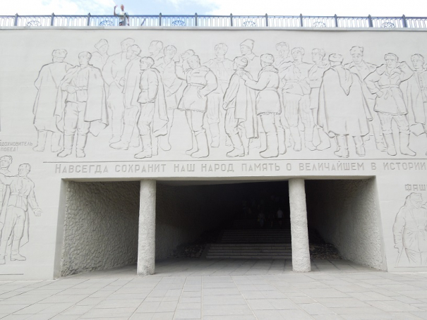 Лестница вывела нас на площадь с большим прямоугольным бассейном. Слева на стене Василий Гроссман воспевает мужество наших бойцов, что своей отчаянностью наводили на врага суеверный страх: кто эти люди? смертны ли они?