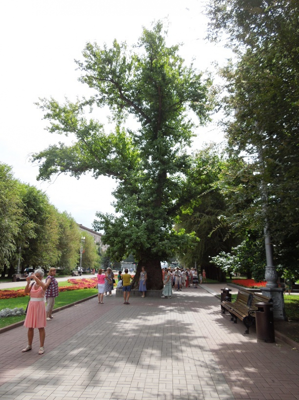 На площади Павших борцов мы обратили внимание на выбившийся из общего ландшафта большой тополь. Дерево, уцелевшее в Великой Отечественной войне, вырубить рука не поднялась. Напротив, в знак почтения его окружили каменным бордюром. И стоит старый тополь как символ возрождения жизни из руин.