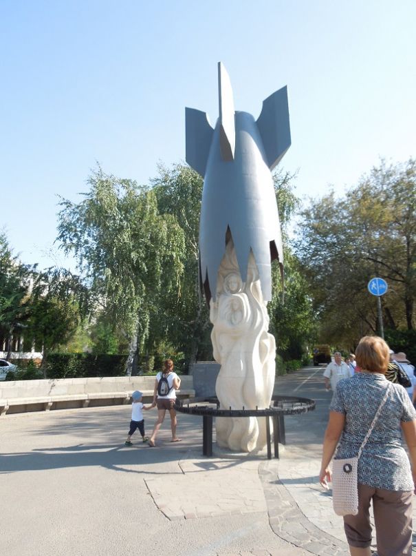 По дороге увидели памятник мирным жителям, погибших при бомбардировках – в виде ракеты, накрывшей стриков и детей.