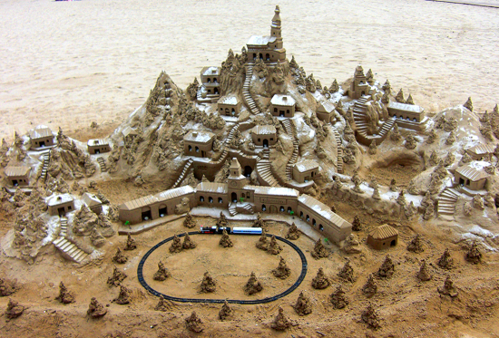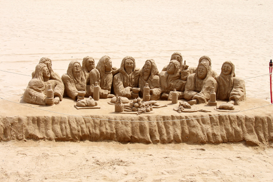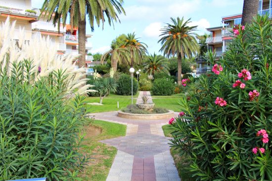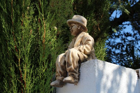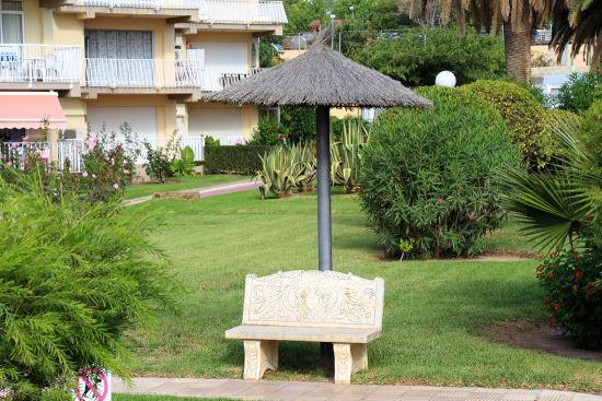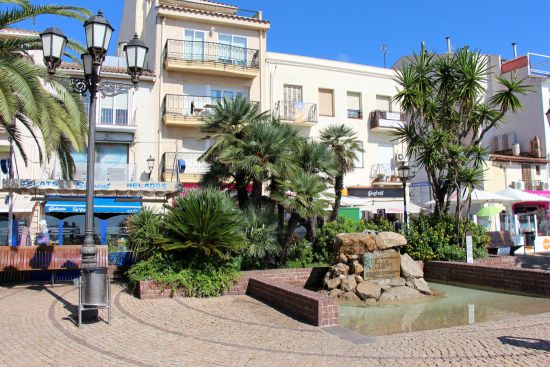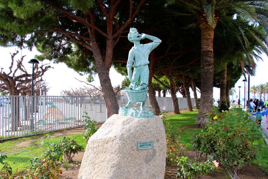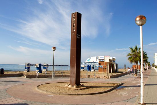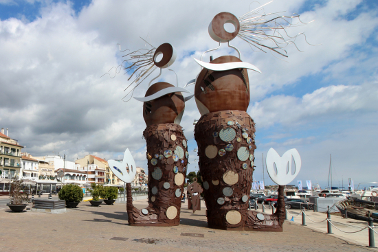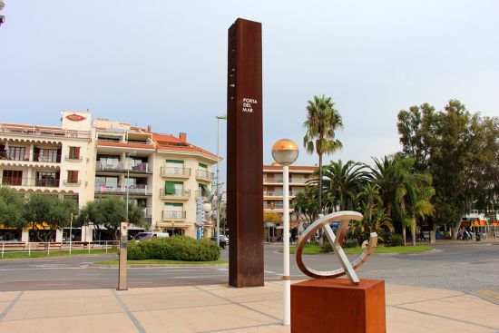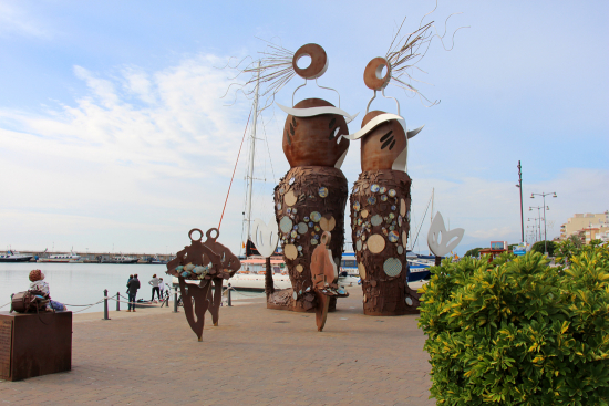 Итак, отправляемся. Прогулка очень приятная, вдоль побережья. С одной стороны песочек и море, с другой отели, вперемежку с частными секторами, куда можно свернуть и тоже пройтись по маленьким улочкам. Или по пути заглянуть в небольшой сосновый парк, где находится первый паровозик, перевёзший пассажиров из Камбрилса. Дойдём до мостика, под которым протекает небольшая речушка, полюбуемся птичками, а также песочными творениями местных мастеров. И дойдём до стелы, знаменующей центр или начало настоящего Камбрилса, потому что отельная зона является отдельным, не так давно появившимся районом.