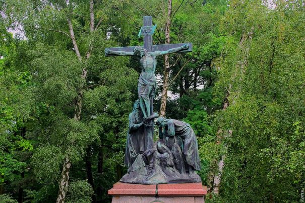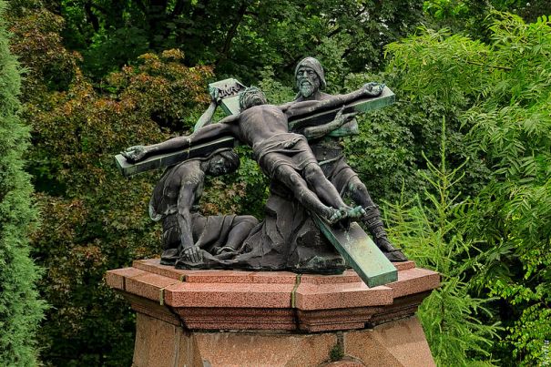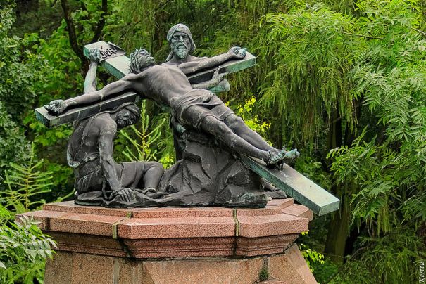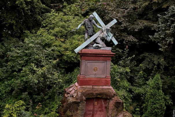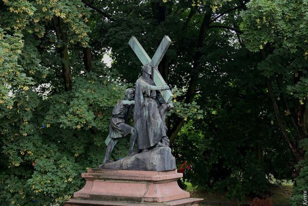 Этот крестный путь находится не в костеле, а в саду, обрамляющем весь комплекс. Статуи в человеческий рост подняты постаментами достаточно высоко, на высоту минимум второго этажа, подойти к ним нельзя, но их отлично можно увидеть с овивающей тот же комплекс стены. Столь же высокой, как и постаменты. Созданы они в 1902-1912 годах польским скульптором Пиосом Велоньским..