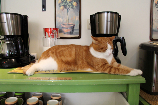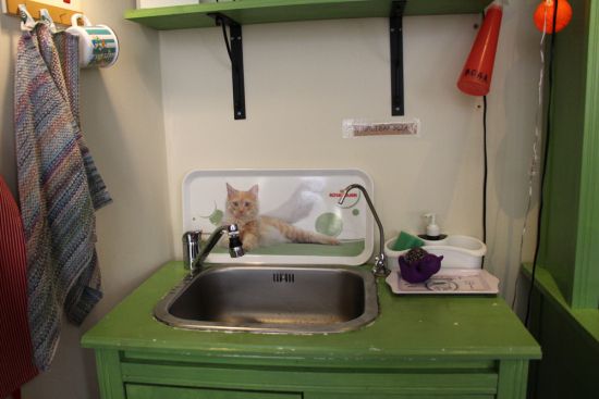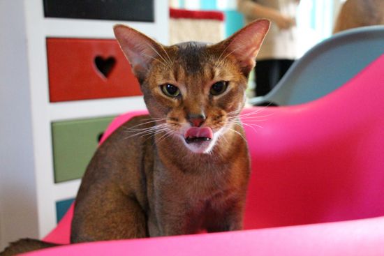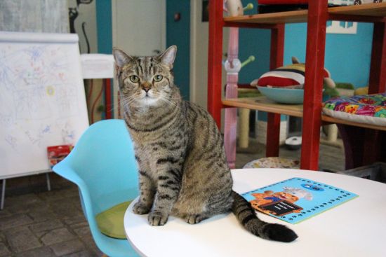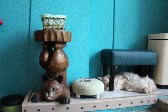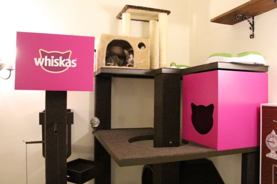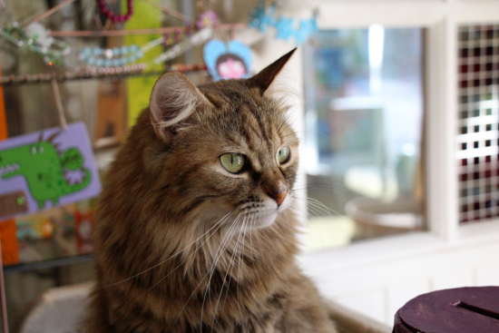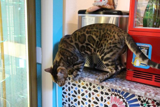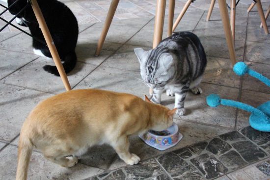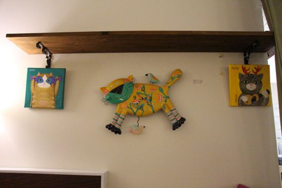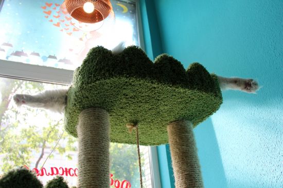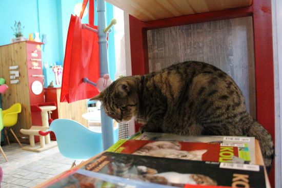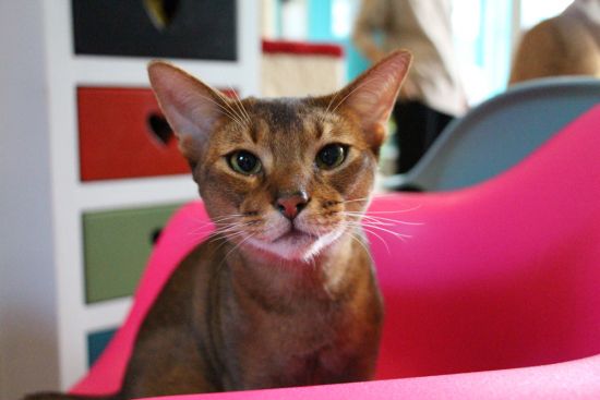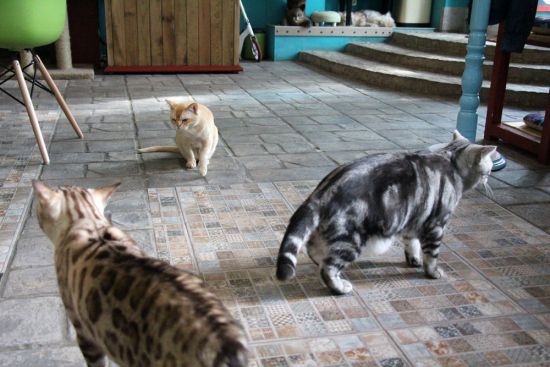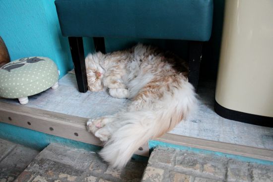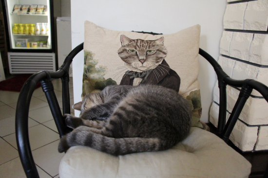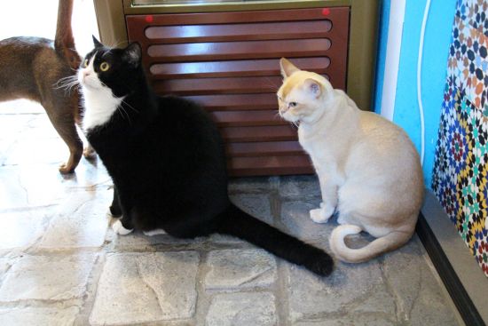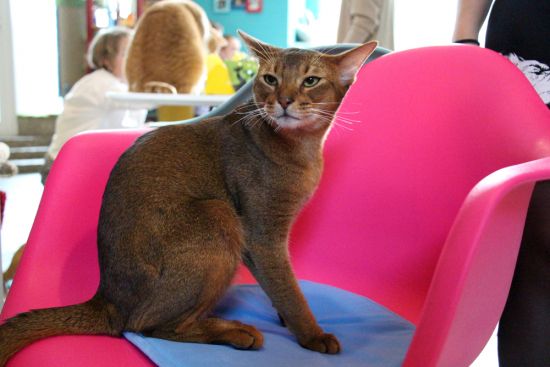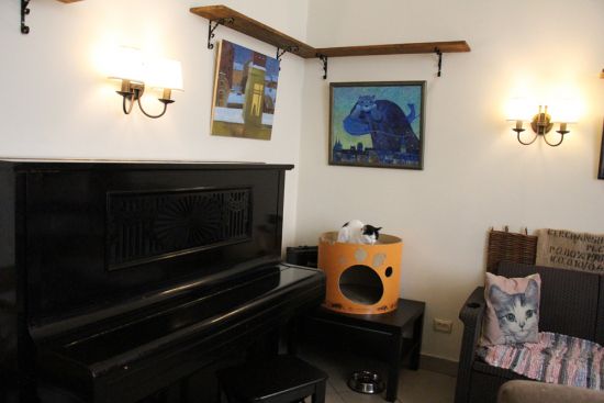 Это настоящее кафе. То есть, можно заказать кофе, чай, десерты… можно позавтракать или пообедать. И, конечно же, пообщаться с кошками. И поиграть, и покормить. Кошки породистые. Как нам сказали, сейчас в кафе проживает 14 кошек.