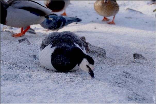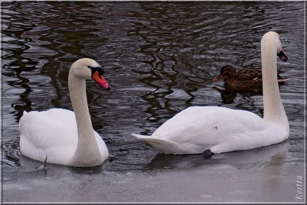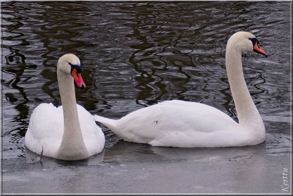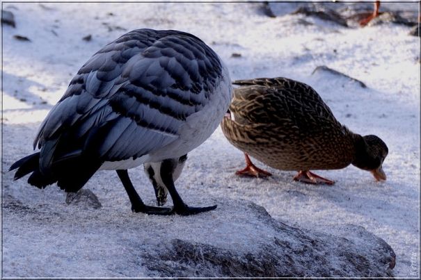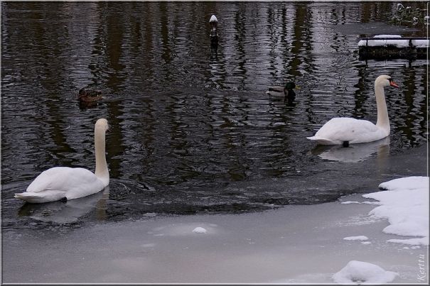 Лебеди, как же без них… голодные как не знаю что, потому что под снегом ничего достать не могут. И так как эта пара мои хорошие знакомые, я не могу просто встать на берегу с фотоаппаратом — сразу же плывут ко мне… приходится кормить.