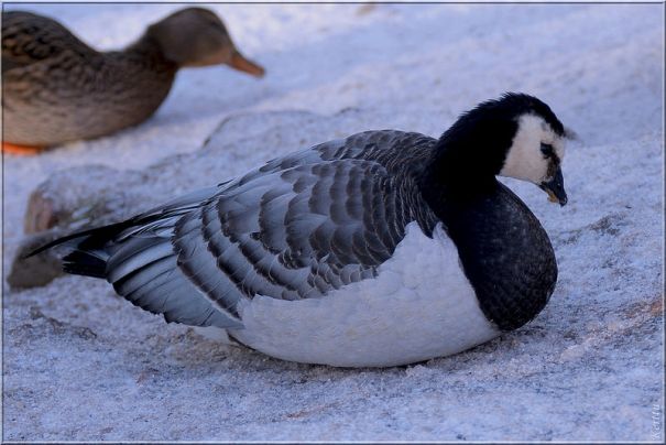 Эта птычка кажись гусь. Поселилась вместе с утками… но уток побольше и оперение не совсем такое.