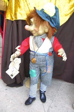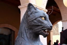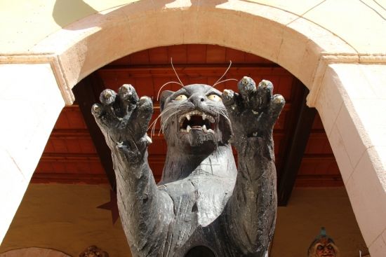 И кот и эти ведьмы — гиганты старые. Если немножко рассказать о гигантах, то они есть в каждом городе. В каждом свои. Эта троица очень старая. Поэтому тот же котик достаточно тяжёлый. (Попробовали его поднять, пока стоял). А ведь его носит один человек. Правда, носильщики меняются каждые десять-пятнадцать минут. Изнутри поднять его легче, там поручни. Но нужно ещё учитывать и то, что кондиционера внутри гигантов нет. Да и вес. А уж, когда гиганты пошли в гору, по ступенькам, по которым люди идут налегке и многие останавливаются передохнуть, то остаётся только аплодировать.