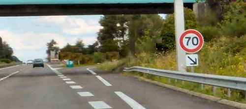 Да, именно это фэйк! Я слямзила фотку с портала путешествий по Франции и аляповато замаскировала знаки, говорящие о повороте на другую дорогу. Но вот так во Франции означается парковка или моторест по дороге. Раз нет знака «поворот», а есть маленькая, чуть ли не рукой накарябанная стрелочка, это значит: ВНИМАНИЕ! Это парковка. Главное, успеть заметить эту стыдливую черную стрелочку под знаком ограничения скорости до 70 и помнить, что это не ограничение скорости для автобана, а именно для тех, кто ПОВОРАЧИВАЕТ.