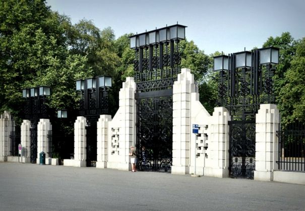 Главные ворота (кованое железо и гранит) состоят из пяти больших ворот, двух маленьких для пешеходов и двух крытых медью контрольно-пропускных пунктов, украшенных флюгерами. Главные ворота были установлены в 1942 году на деньги Норвежского банка.