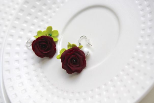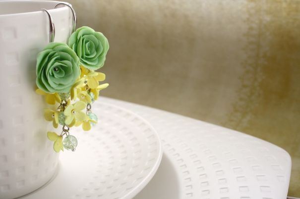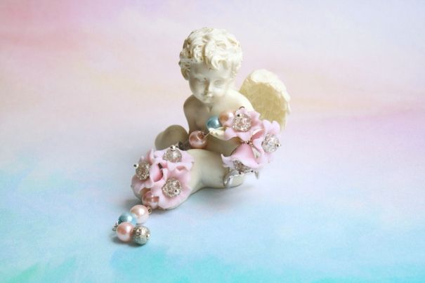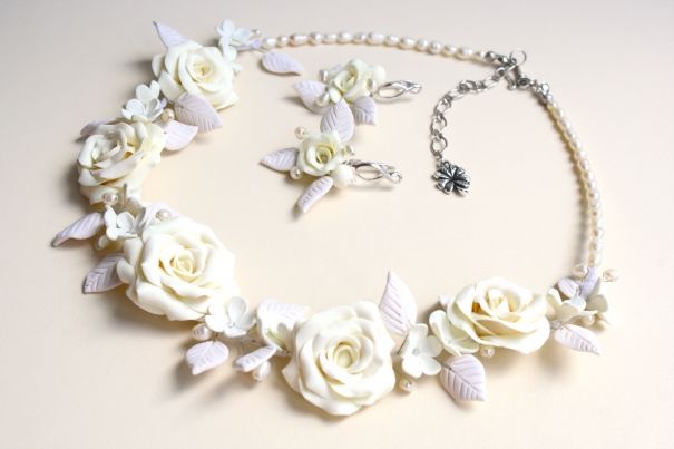 А это было сделано для невесты. Здесь я намешала три похожих оттенка полимерки: шампань, слоновая кость, айвори. Речной жемчуг, подвеска — четырехлистный клевер, что бы повезло))