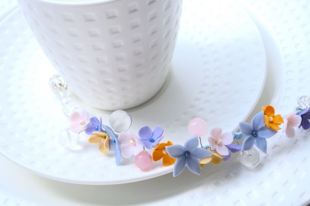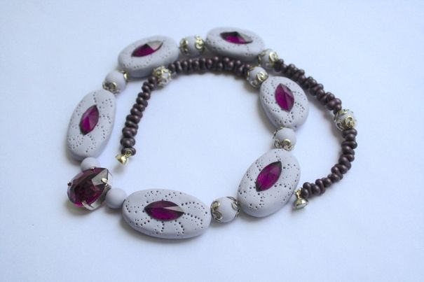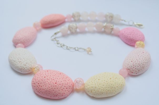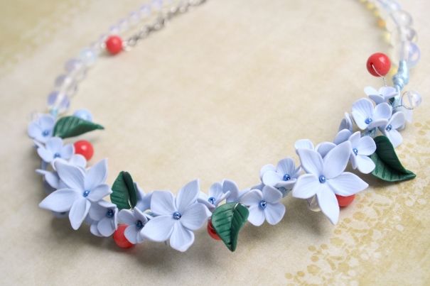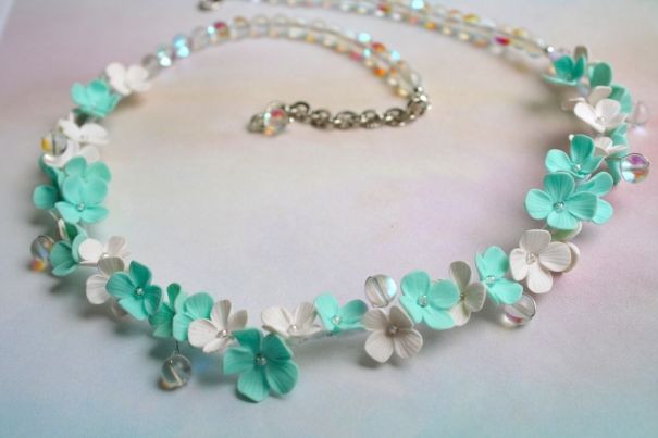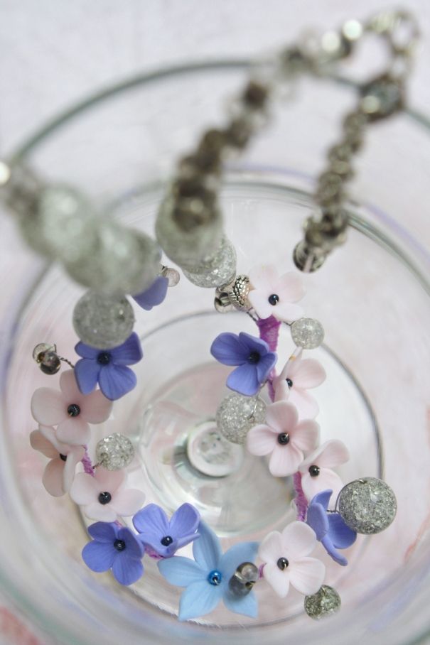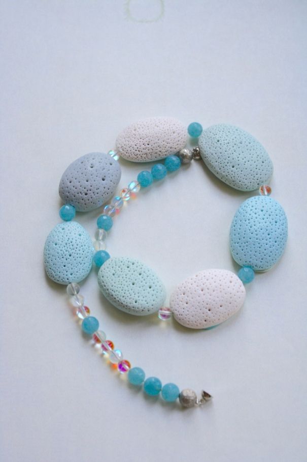 Крупные детали в колье на этом фото — тоже полимерная глина. Я тыкала иголочкой в каждую много раз, что бы получить пористый эффект. Голубой люблю в принципе, поэтому работала с его оттенками с огромным удовольствием