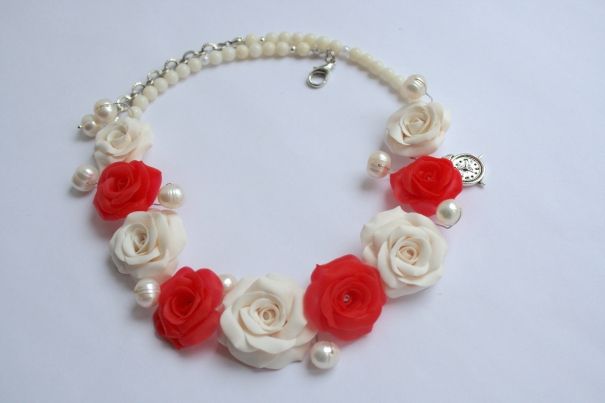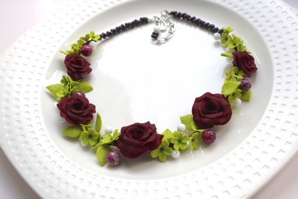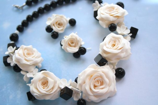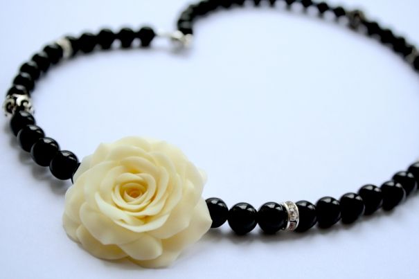 Черный гладкий, как клавиши рояля, обсидиан и светлая роза. Колье асимметричное, поэтому роза располагается на ключице девушки. Цветок светится в темноте фосфором, специальная глина, эффект прикольный.