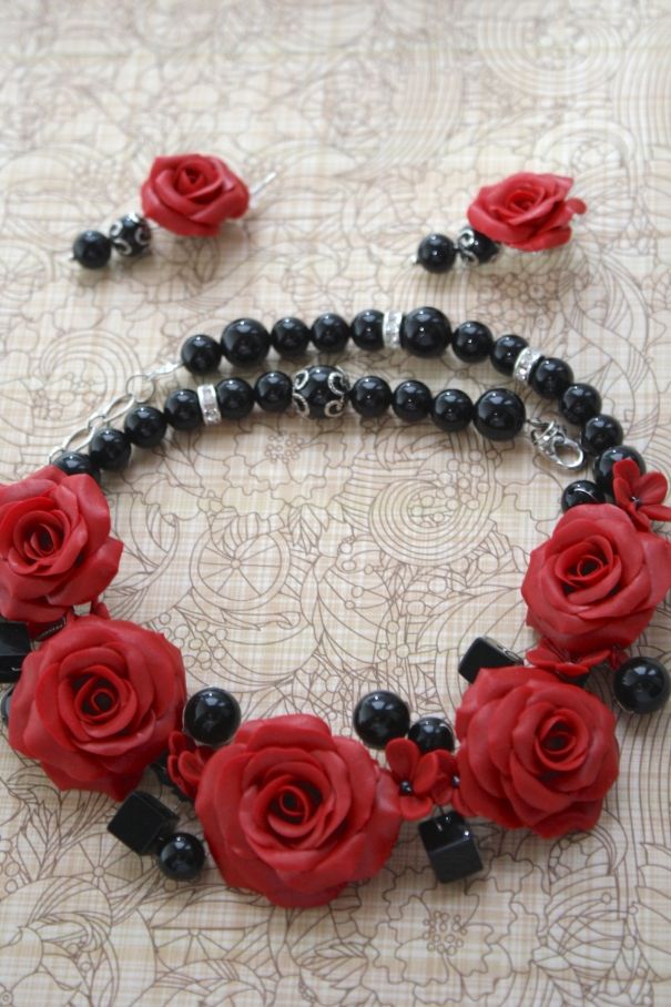 Вот одна из первых моих работ. Розы, черный агат, фурнитура — под античную бронзу
