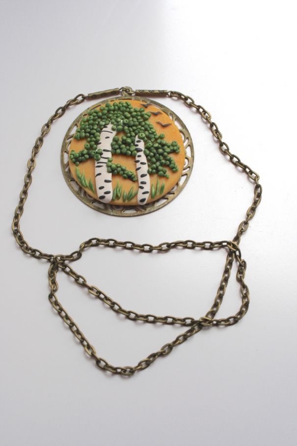 Это попытка работы с полимерной глиной в технике филигрань (работа с малыми деталями). До совершенства мне еще пахать и пахать, но тем не менее, перед вами кулон-картина, представляющая берёзы на закате