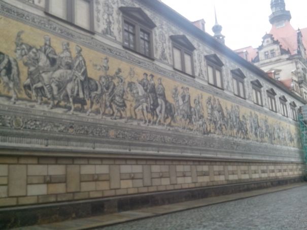 А вот настенное панно «Шествие королей» чудом уцелело. На самом деле чудом уцелела стена. Сама же картина, выполненная из знаменитого мейсенского фарфора – каждая плиточка, составляющая огромную картину, расписана вручную и обжигается в печи при очень высокой температуре – мужественно выдержала огненный смерч.