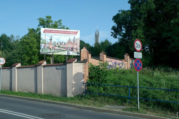 Оказывается, что есть остановка «Sanktuarium miłosierdzia Bożego» или Санктуариум Божьего милосердия. Выходим… и обычная дорога, вокруг ничего похожего на то, что нам надо. И тут же видим характерный шпиль по другу сторону дороги. И тут же указатели. Все же для паломников стараются больше, чуточку, чем для туристов.