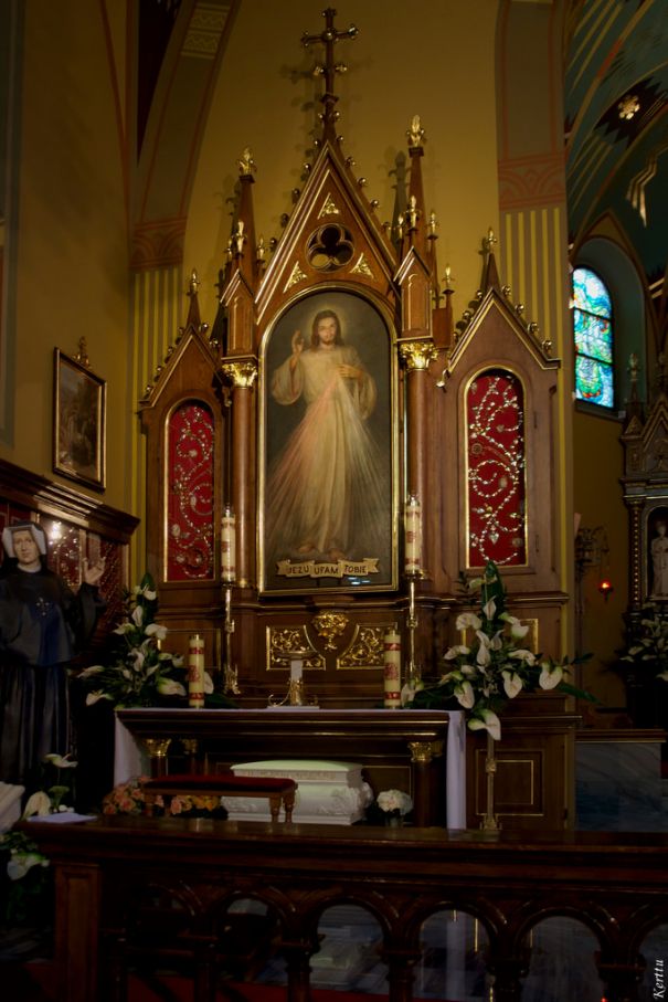 С правой стороны та самая икона, которую я вам уже показывала. Это копия, хотя и нарисованная, на не фотокопия, первая нарисованная икона находится в Вильнюсе. Рядом с ней – фигурка святой Фаустины. О Фаустине я расскажу позднее, скажу лишь, что образ нарисован с ее слов, с объявления ей Христа в монастыре в Плотске 22 февраля 1931 года. Особые слова под иконой «Иисус, верю Тебе». Скорее даже «доверяю». Под иконой – гроб святой Фаустины, которая умерла в 33 года, в 1938 году здесь, в монастыре.