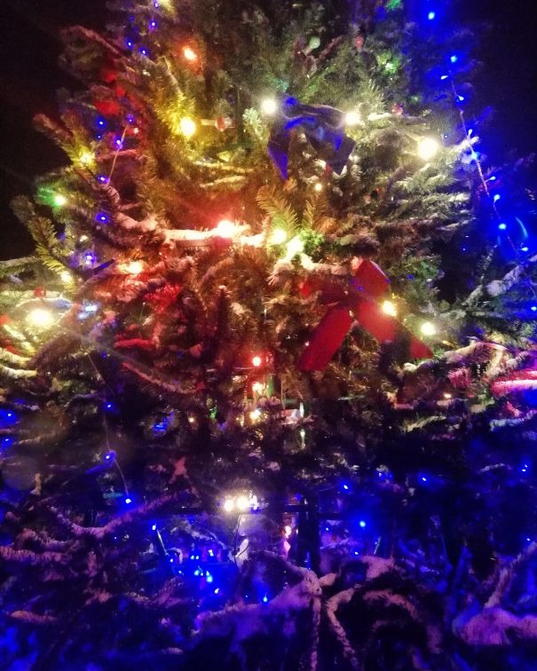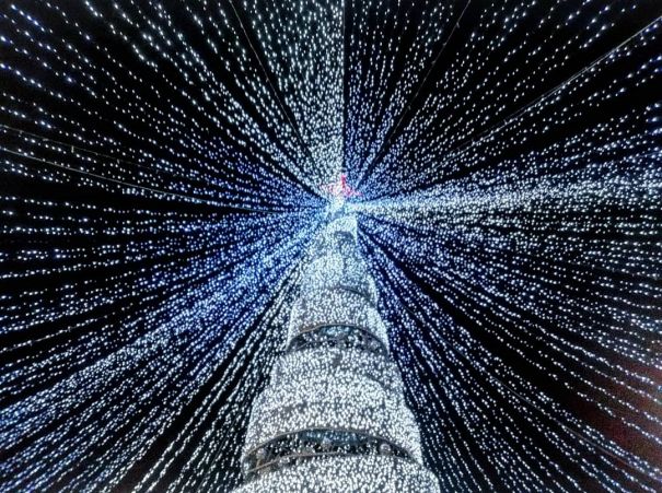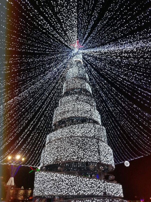 Ну и напоследок покажу вам ёлку, которая меня впечатлила. И не только меня, судя по тому, что она вошла в рейтинг из 16-и самых красивых ёлок Европы. Это «ёлка без ёлки», сделанная в виде светящейся ленты. Лично мне она напомнила сверкающий торт