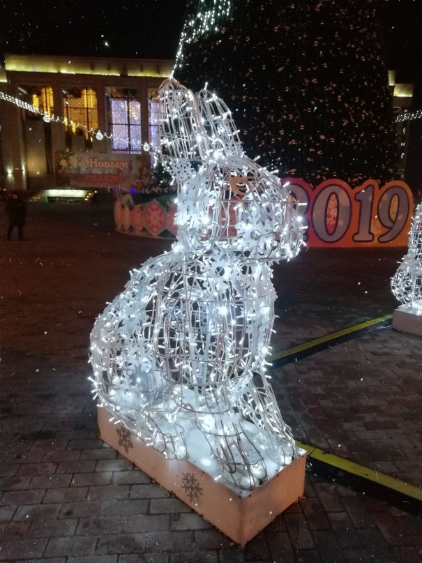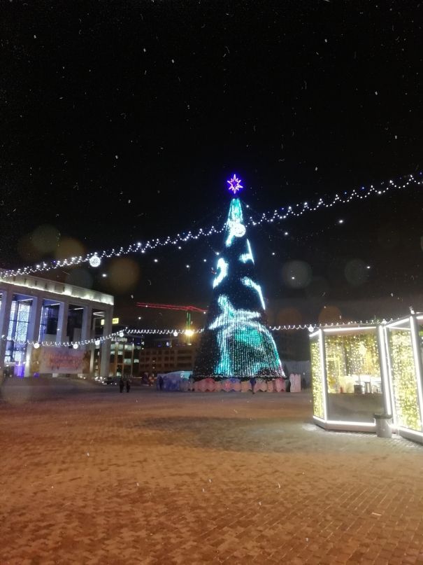 Главная ёлка страны в этом году меня несколько разочаровала, оказавшись всего лишь большим проектором для постоянно меняющихся неоновых узоров. Зафиксировать хотя бы один из них внятно было сложно, равно как и сфотографировать неоновую красавицу вблизи. Вернее, вблизи всё выглядело скорее набором пикселей. Поэтому — ёлка, вид издали и окружающие её вполне симпатичные шары, снеговики и зайки:
