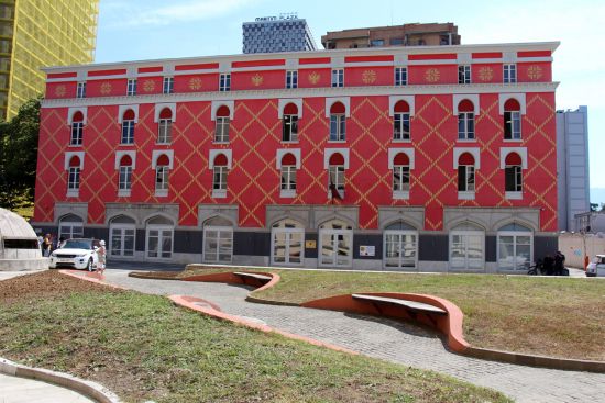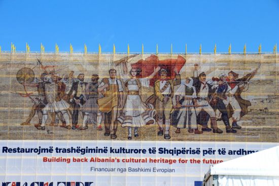 Сохранившаяся с социалистических времён фреска истории Албании на Национальном историческом музее.