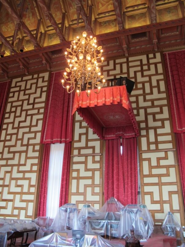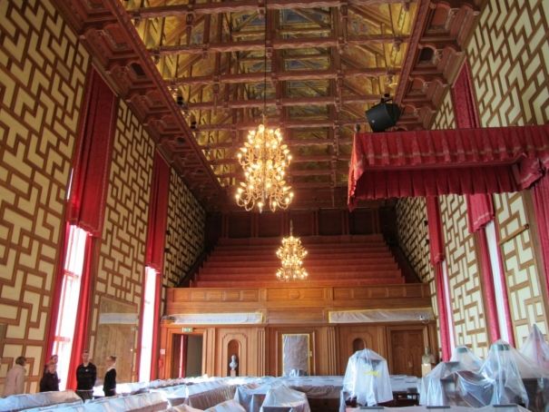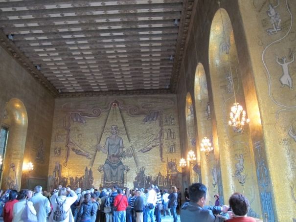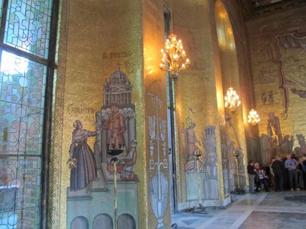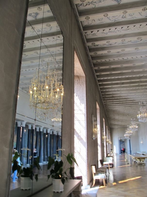 Кроме прочего, именно тут с тысяча девятьсот тридцать пятого года идут банкеты по поводу награждения лауреатов Нобелевской премии. Любопытный штрих — на зеркалах располагаются половины люстр. Отражаясь в зеркале, они кажутся круглыми.