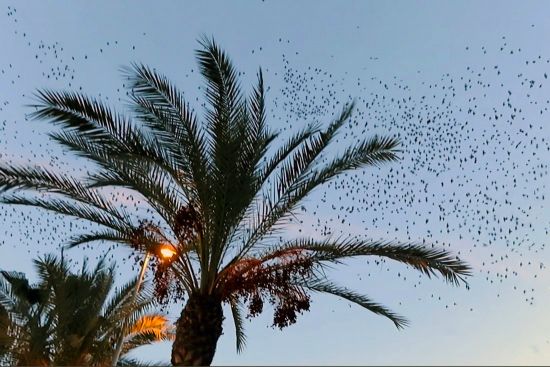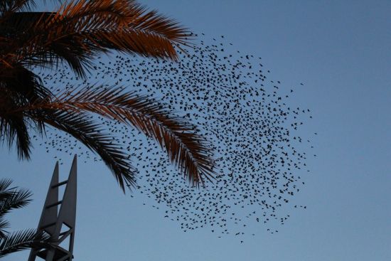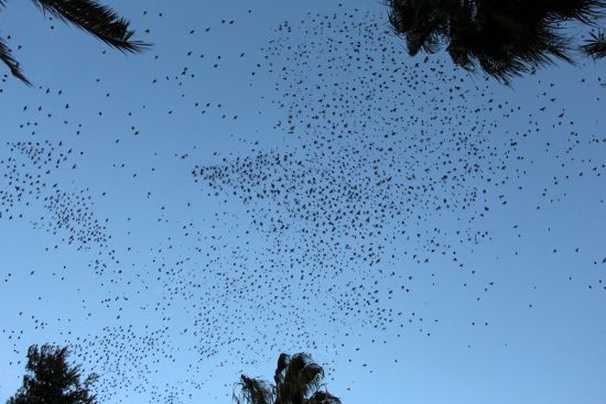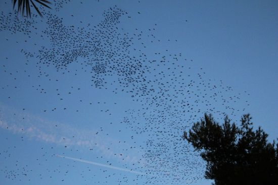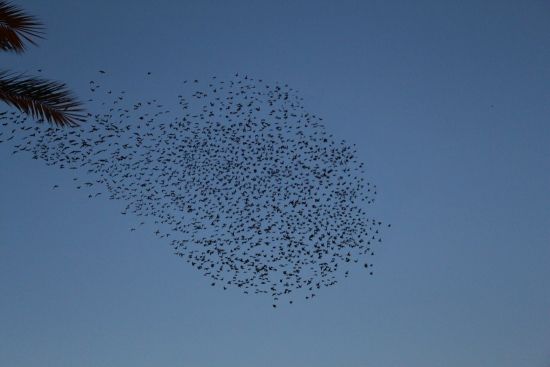 В декабре-январе в небе появляются тучи. Тучи из птиц. Это скворцы. Появляются они перед закатом. Зрелище удивительное и красивое. Птицами будто кто-то управляет. Туча может распадаться, соединяться, принимать причудливые формы, но при всей плотности этих туч, птички не натыкаются друг на друга.