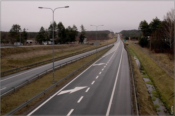 Идем дальше. То самое шоссе. С правой стороны за деревьями спрятался тот проклятый заводик, чуть дальше, не видно отсюда — река. Там где совсем в конце снимка горка — та дорога, по которой можно пройти под автострадой, которой я возвращалась. Путь от того места, где я тогда стояла, до той нырнувшей под автостраду дороги — не меньше часа в обход.