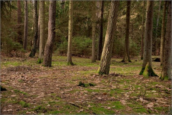 Тут видно то, что раньше я либо не встречала, либо не замечала — очень яркая граница между разными лесами. По одну сторону дороги — елки, по другую — сосны. Исключительно елки, исключительно сосны.