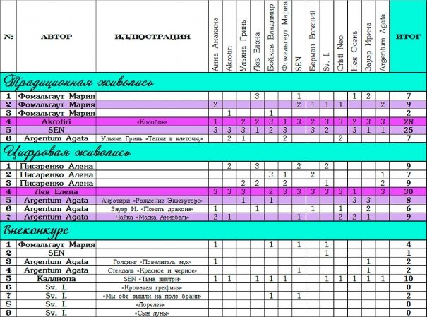 К сожалению Писаренко Алена не проголосовала и баллы, набранные её работами, аннулируются. (но в таблице я их оставила, вдруг Алена заглянет)