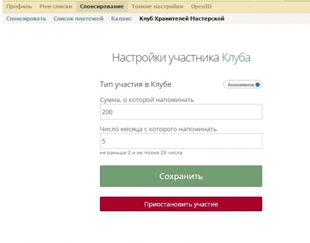 В качестве настроек можно указать тип участия (анонимный или открытый), так же указать предполагаемую ежемесячную сумму взноса (не менее 100р.) и день месяца, начиная с которого надоедать вам оповещениями… Так же можно временно приостановить (или восстановить) свое участие в клубе.