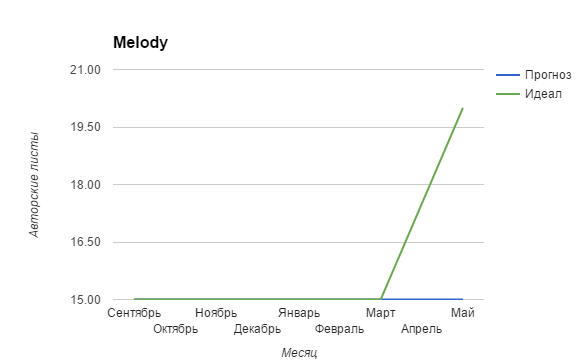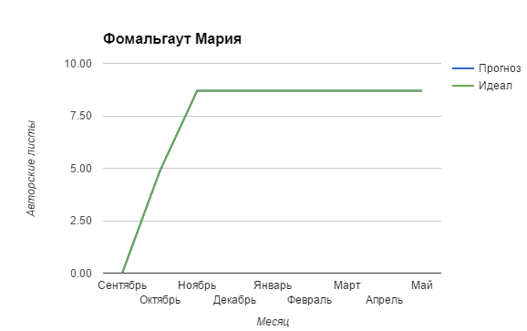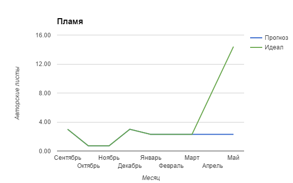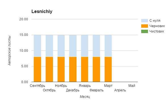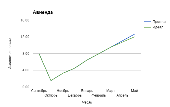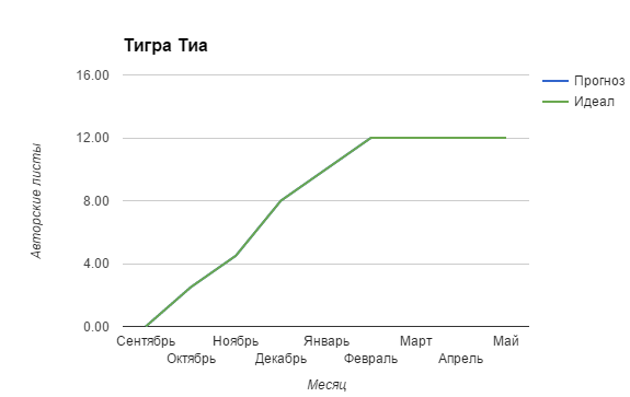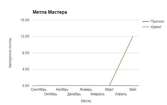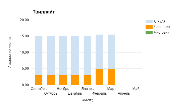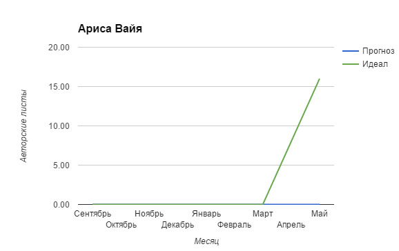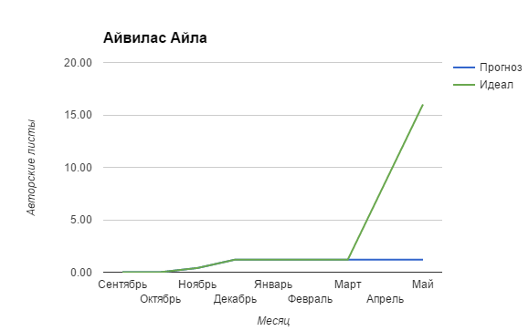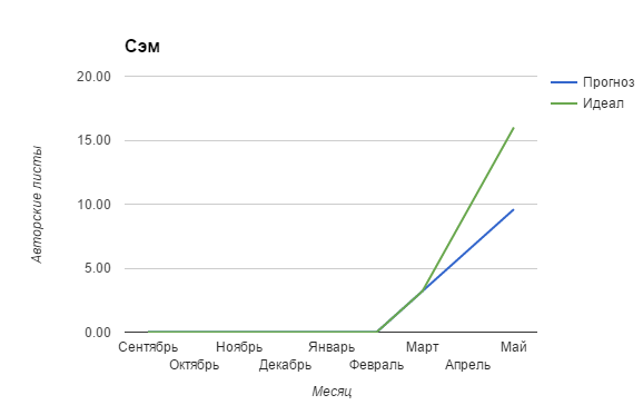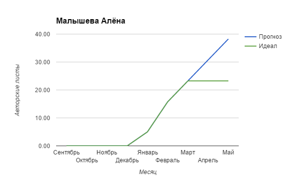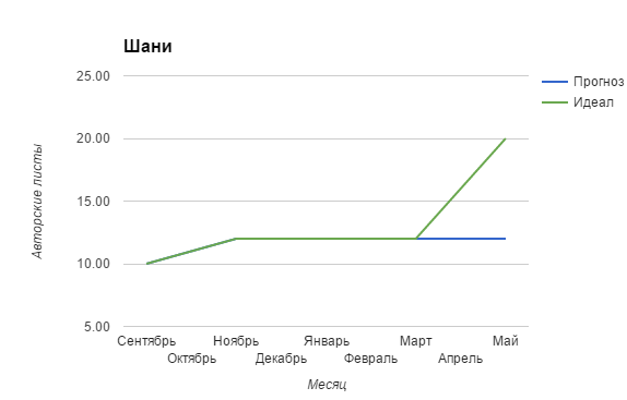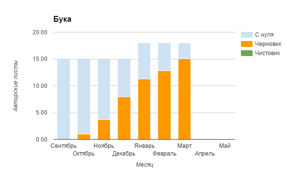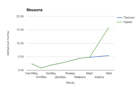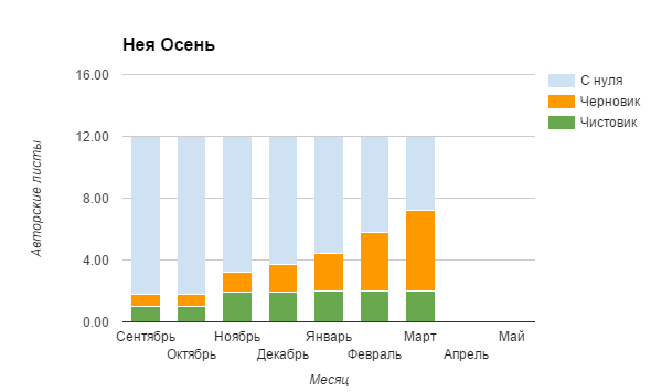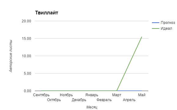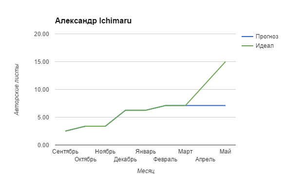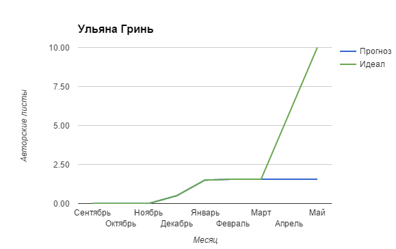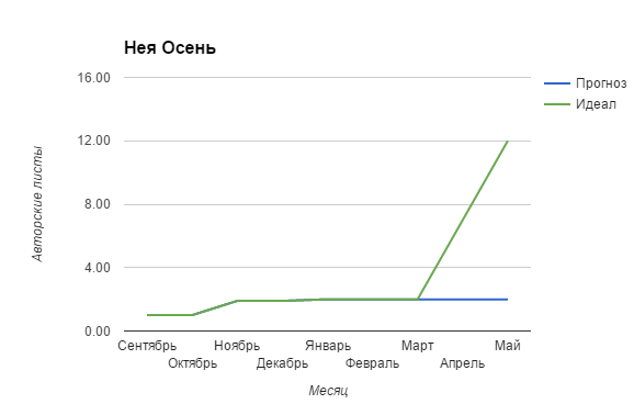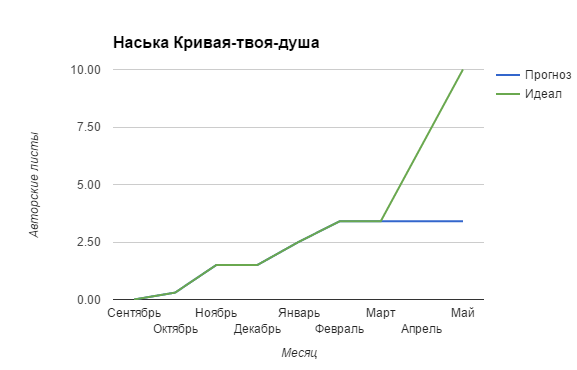 Вторая картинка — это то, как будут развиваться события, если вы сохраните текущую скорость работы над чистовиком — зеленая линия (черновик тут не учитывается, потому что читателям нужен чистовик, как ни крути). Синяя линия — это как в идеале нужно бы писать, чтобы равномерно дойти от стартового объема чистовика до желаемого общего объема.