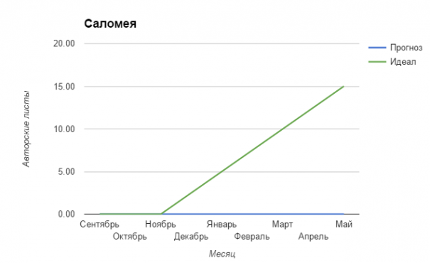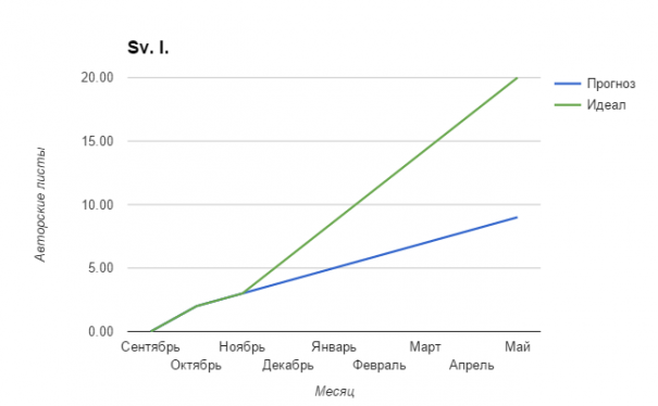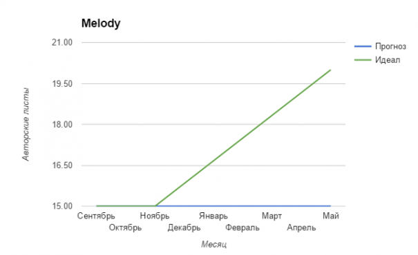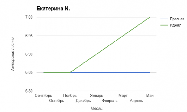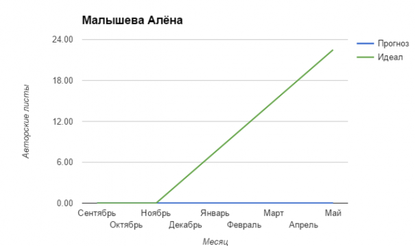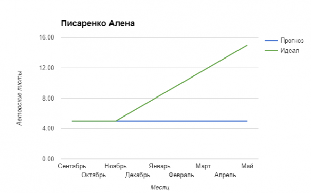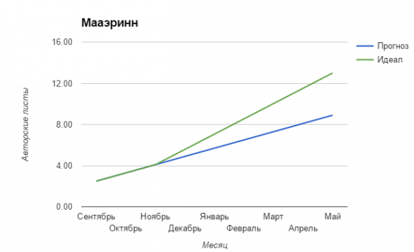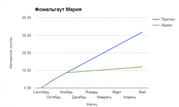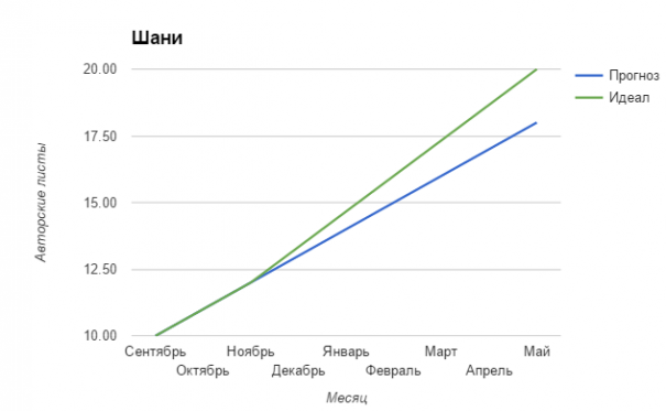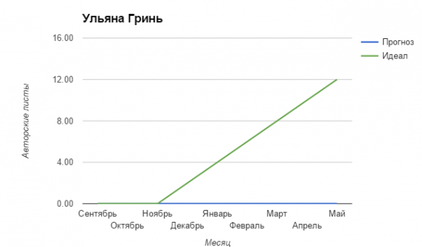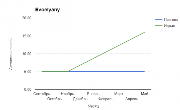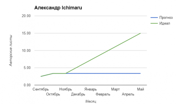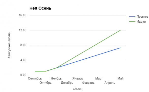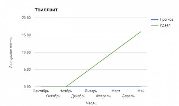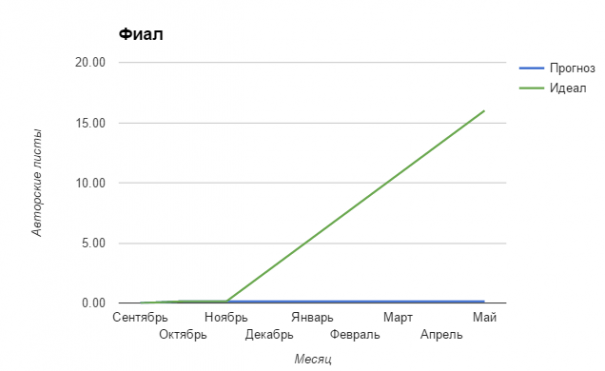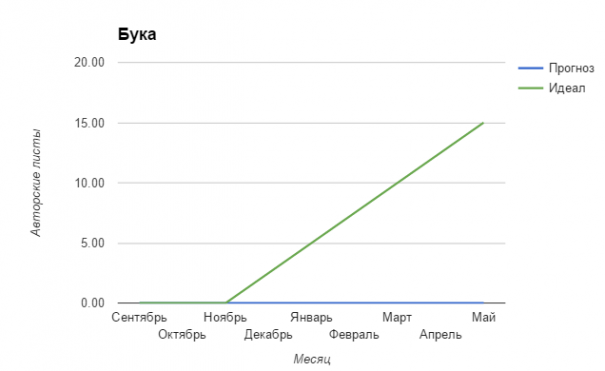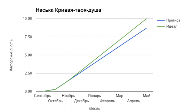 Вторая картинка — это то, как будут развиваться события, если вы сохраните текущую скорость работы над чистовиком — зеленая линия (черновик тут не учитывается, потому что читателям нужен чистовик, как ни крути). Синяя линия — это как в идеале нужно бы писать, чтобы равномерно дойти от стартового объема чистовика до желаемого общего объема.