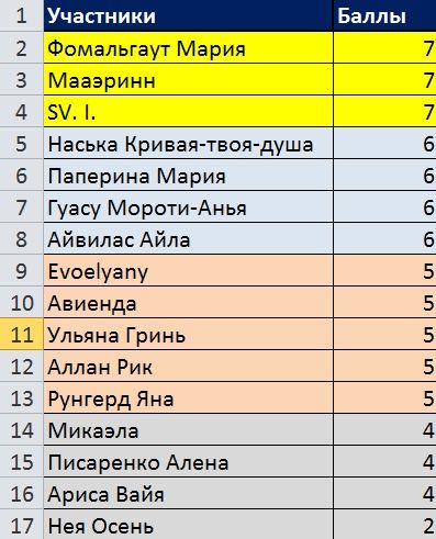 Желтым — первое место, голубым — второе, рыжим — третье.