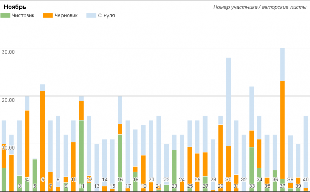 Тут тоже у всех картина разная, конечно. Большинство пишет и хоть не великими темпами, но к цели движется. Некоторые загружены работой и другими реальными делами — пока не втянулись. Но, надеюсь, еще втянутся — время впереди есть.