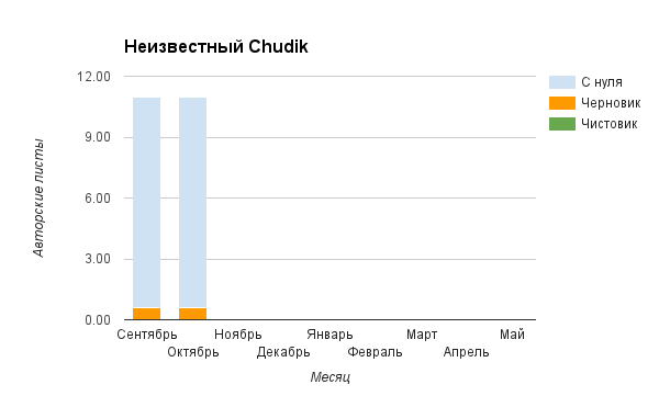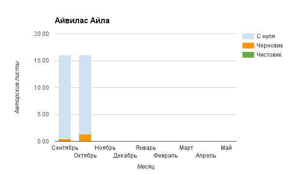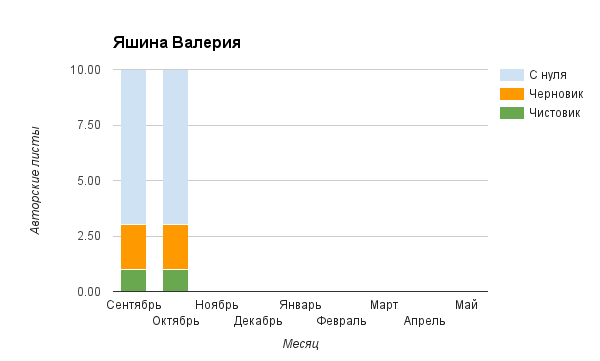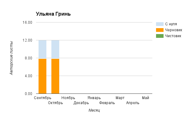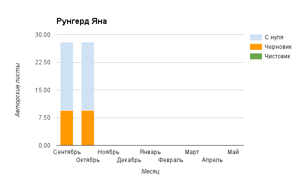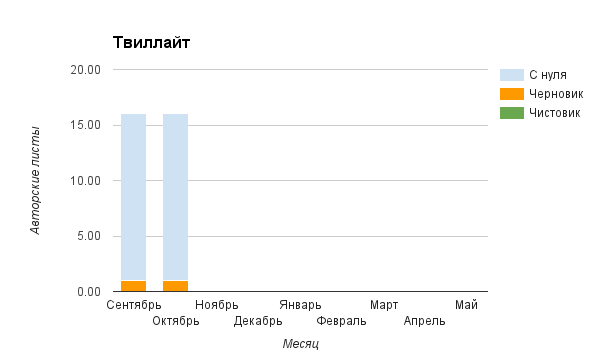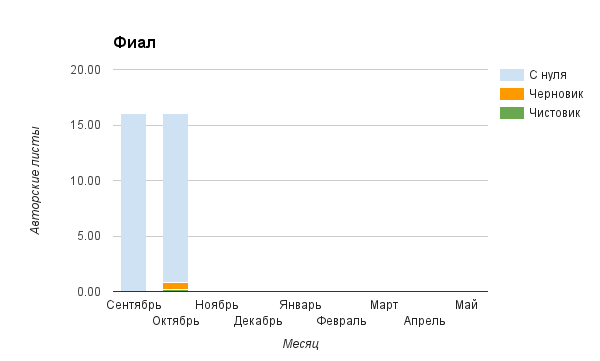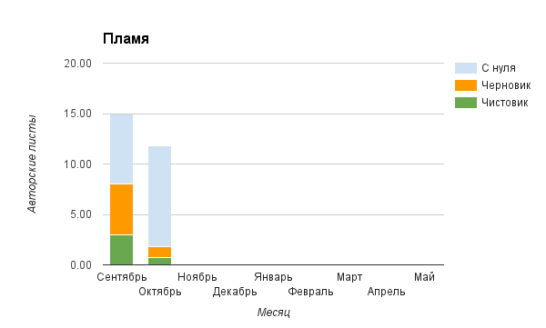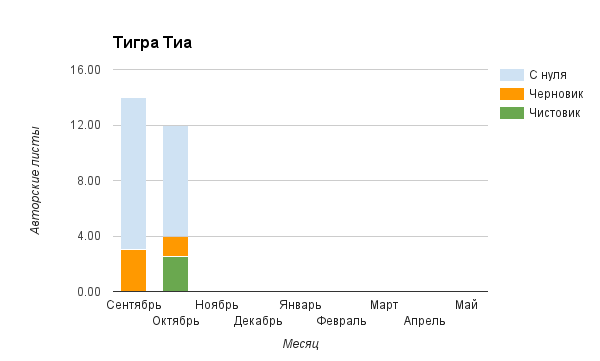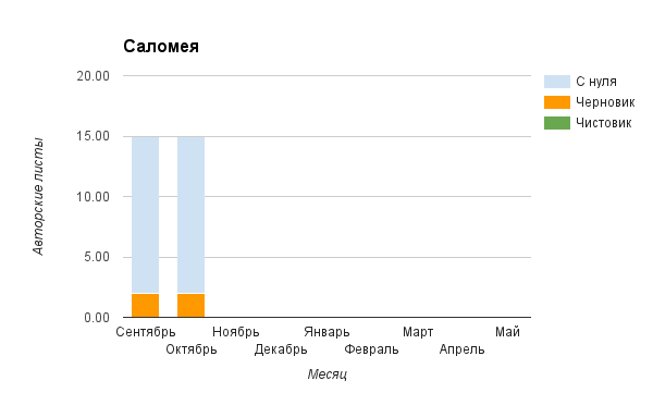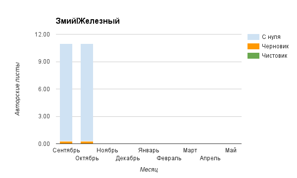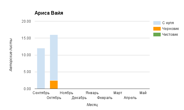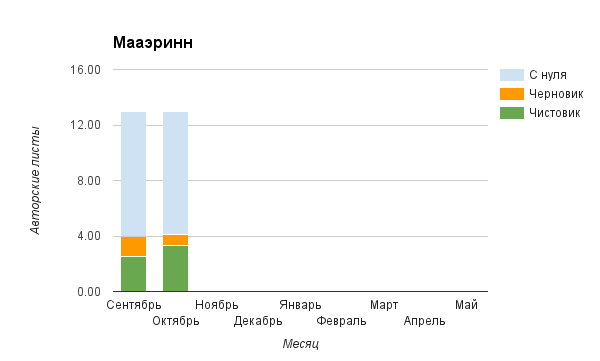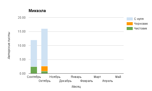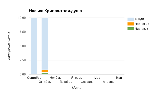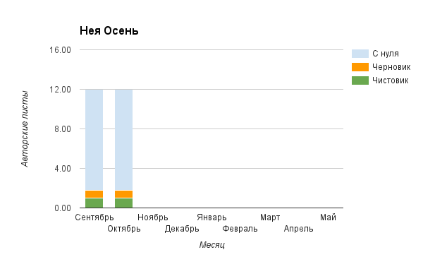 Прогресс у нас разнообразный, как я уже и говорила. Самый крутой график прибавки чистовика у Фомальгаут Марии, а самые любопытные графики с отрицательным наклоном у Авиенды, Лидьив Фентарский и Пламя Таннэк, Папериной Мирины и Микаэлы — это значит, что они провели немалую работу по переоценке ценностей в своих произведениях. Подробно в этот месяц про графики рассказывать не буду, смотрите на картинки сами.