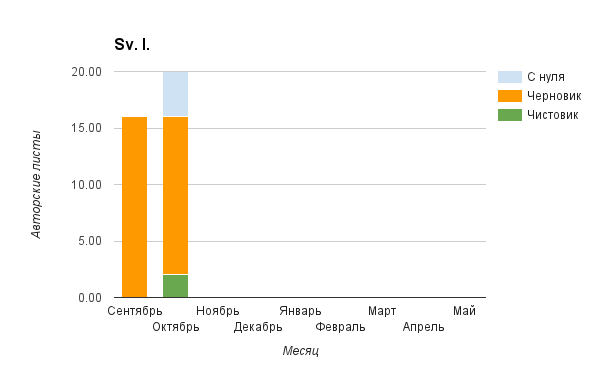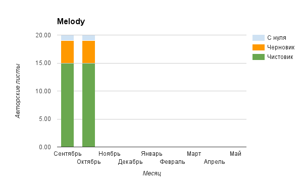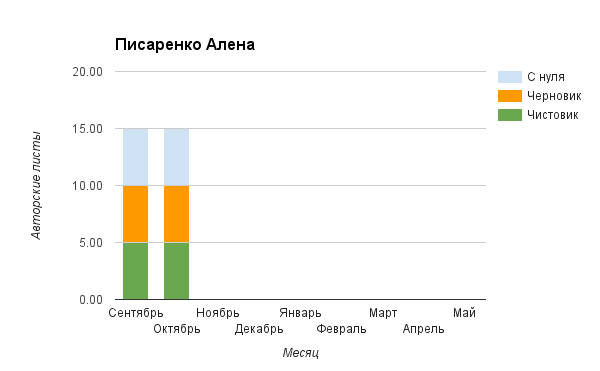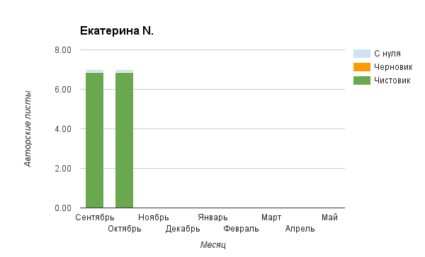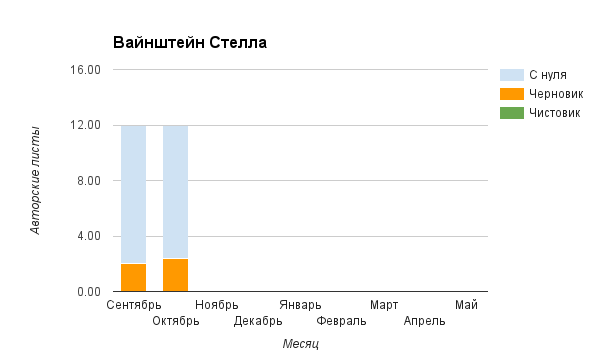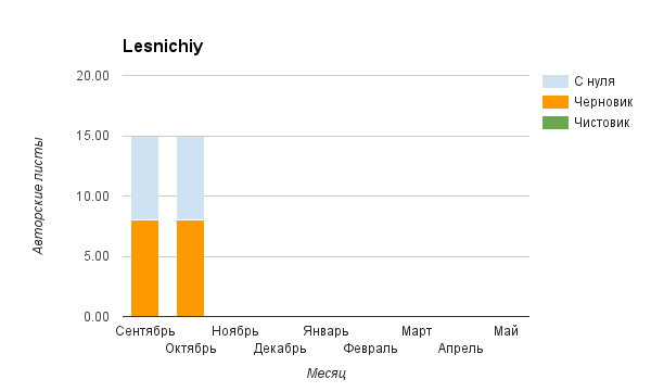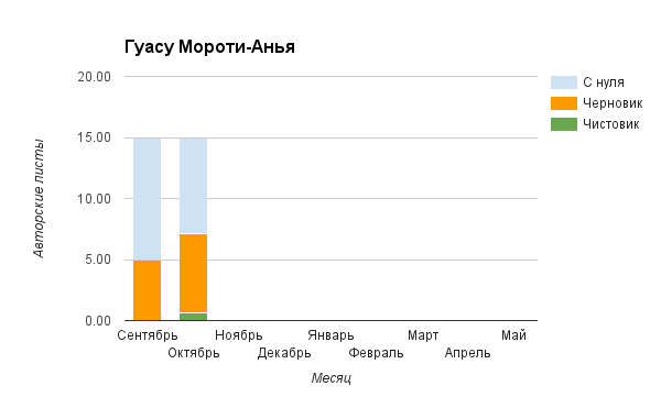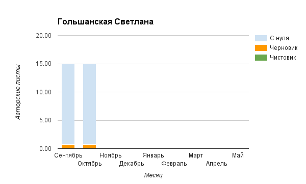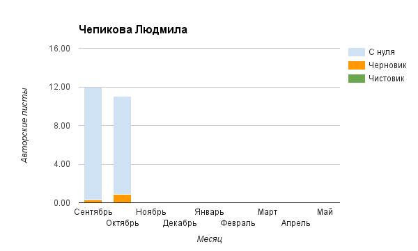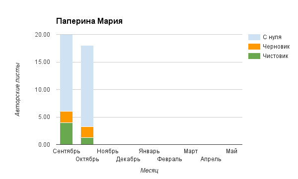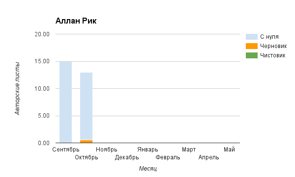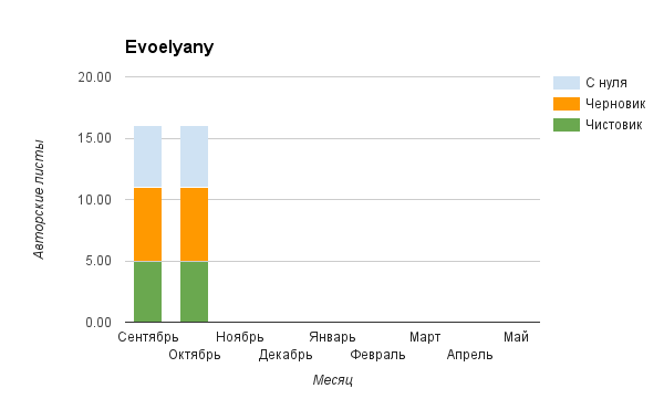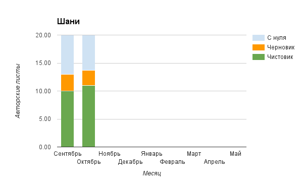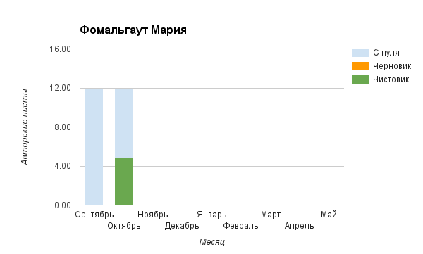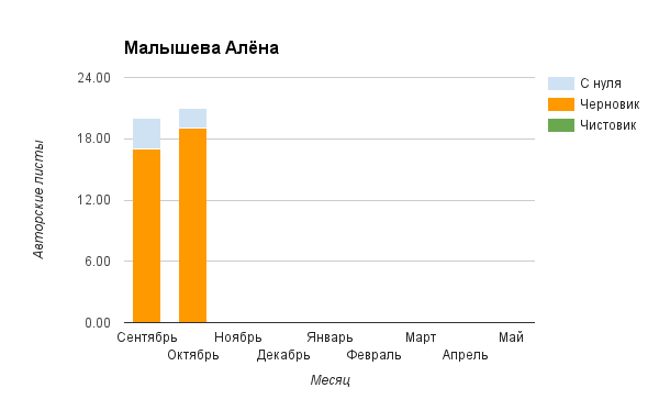 Прогресс у нас разнообразный, как я уже и говорила. Самый крутой график прибавки чистовика у Фомальгаут Марии, а самые любопытные графики с отрицательным наклоном у Авиенды, Лидьив Фентарский и Пламя Таннэк, Папериной Мирины и Микаэлы — это значит, что они провели немалую работу по переоценке ценностей в своих произведениях. Подробно в этот месяц про графики рассказывать не буду, смотрите на картинки сами.