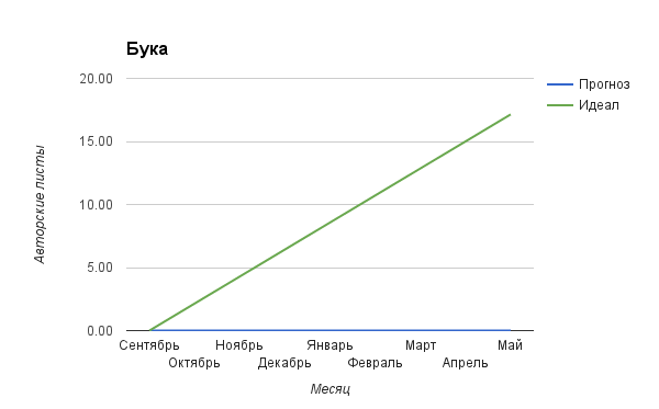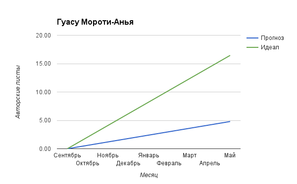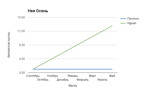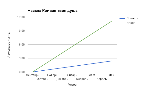 Вторая картинка — это то, как будут развиваться события, если вы сохраните текущую скорость работы над чистовиком — зеленая линия (черновик тут не учитывается, потому что читателям нужен чистовик, как ни крути). Синяя линия — это как в идеале нужно бы писать, чтобы равномерно дойти от стартового объема чистовика до желаемого общего объема.