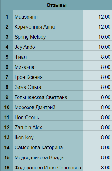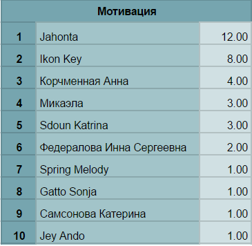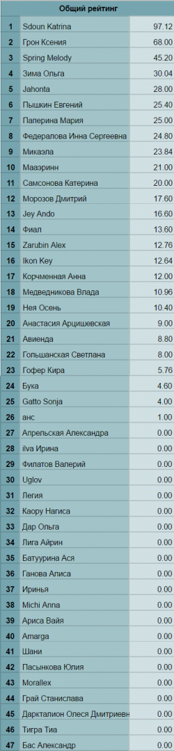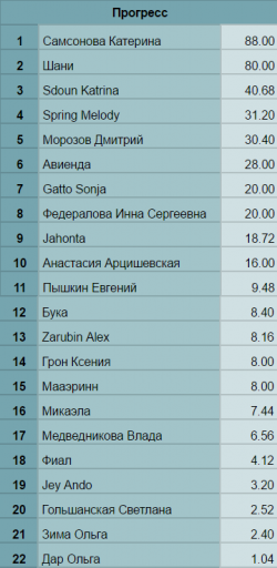 Но это я отвлеклась. Так вот, гордимся мы… Самсоновой Катериной и Шани, они набрали почти одинаково много баллов, за ними с отрывом в половину идёт Sdoun Katrina, и тем не менее это более чем превосходный результат! Так держать!