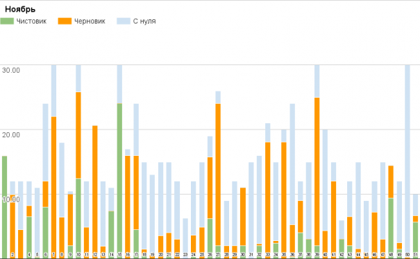 Вторая картинка — это то, как будут развиваться события, если вы сохраните текущую скорость работы над чистовиком — зеленая линия (черновик тут не учитывается, потому что читателям нужен чистовик, как ни крути). Синяя линия — это как в идеале нужно бы писать, чтобы равномерно дойти от стартового объема чистовика до желаемого общего объема.
